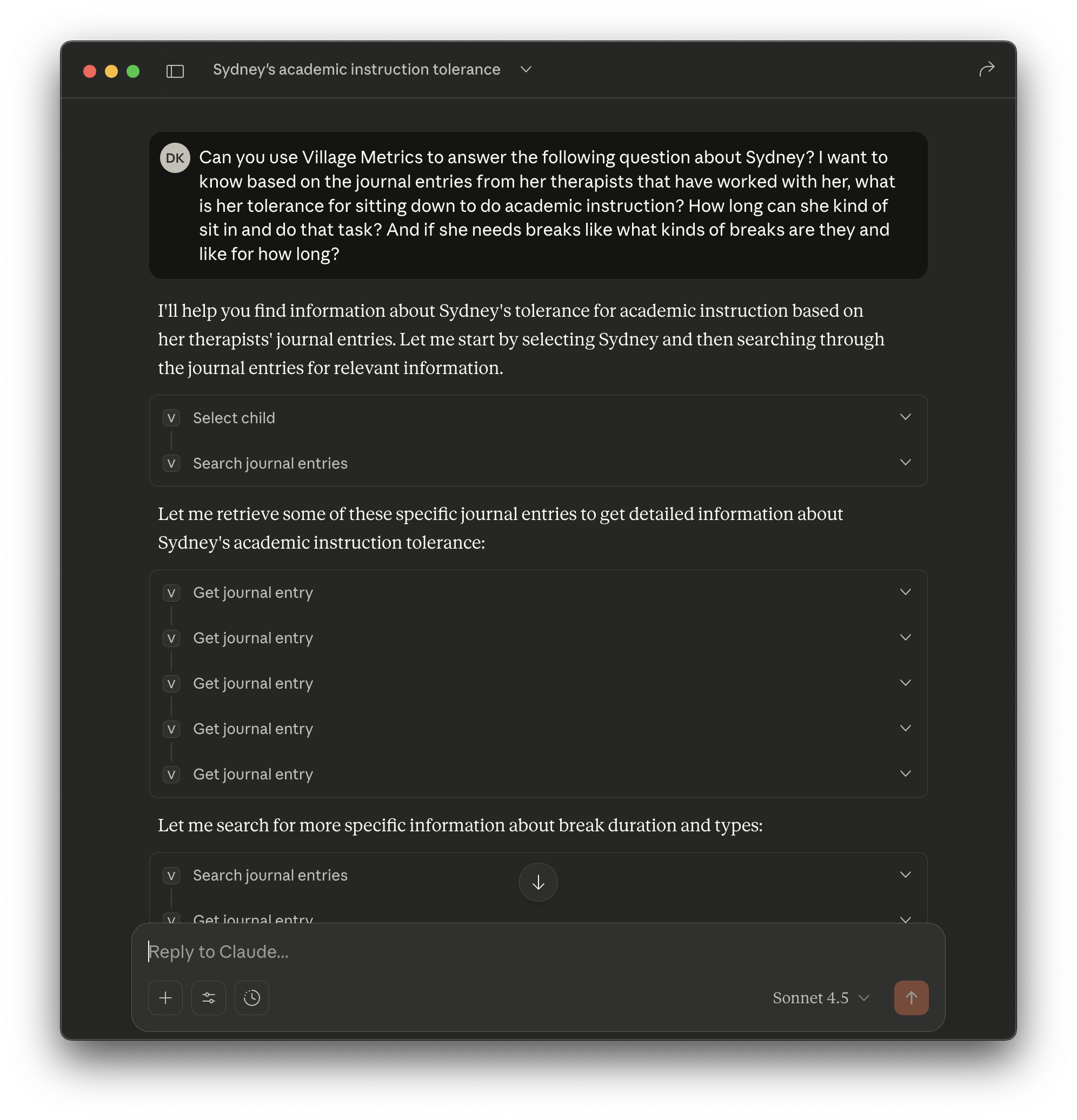 Take your VillageMetrics insights beyond the app. By connecting your account with advanced AI tools like Claude - and soon ChatGPT - you can ask questions, explore trends, and uncover insights about your child’s progress directly from your favorite AI assistant. It’s the same intelligence that powers Ask Anything inside the app, now available wherever you already chat.